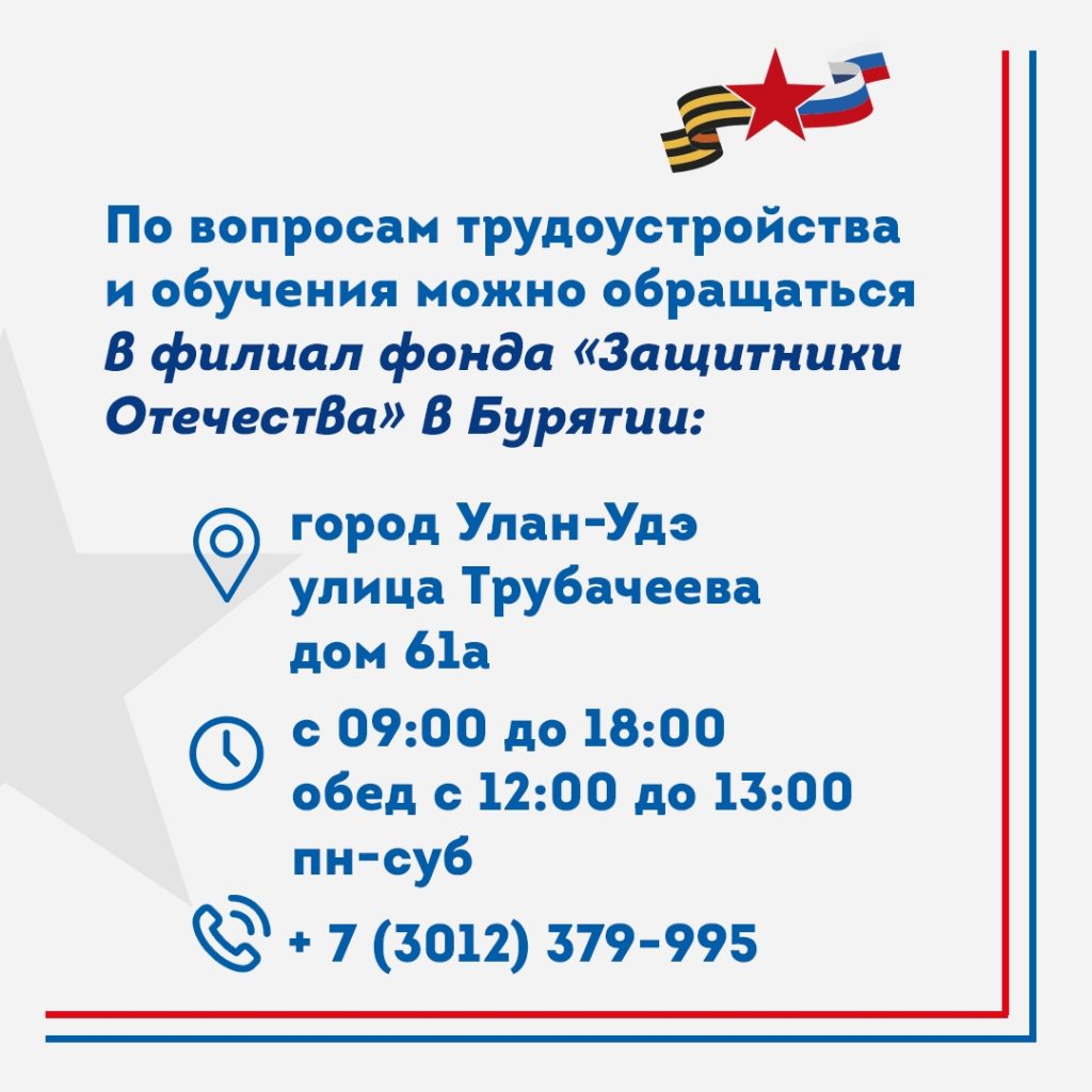 📌По вопросам трудоустройства, обучения и переобучения ветераны и члены их семей могут проконсультироваться у своих социальных координаторов, а также у специалиста по трудоустройству филиала фонда «Защитники Отечества» в Бурятии по адресу: г. Улан-Удэ, ул. Трубачеева, 61а.